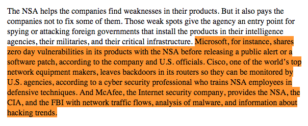 I'm almost certain Microsoft keeps some vulnerabilities on purpose to the help the NSA, and only patches them when other parties report those bugs. In fact, I think the recent "WinShock" or whatever they're calling it, with the remote execution for its TLS library was known by Microsoft. This sort of thing is so much easier to use as an "effective backdoor", than something nefarious NSA would have to implant into Windows such as a key escrow or whatever (not saying those don't/won't exist in TPMs).